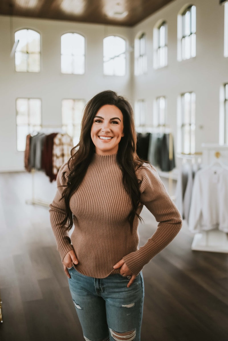 This sweater features long sleeves with a puff at the shoulder, offering a modern and stylish look. The sweater also includes a mock neck, adding a touch of sophistication.