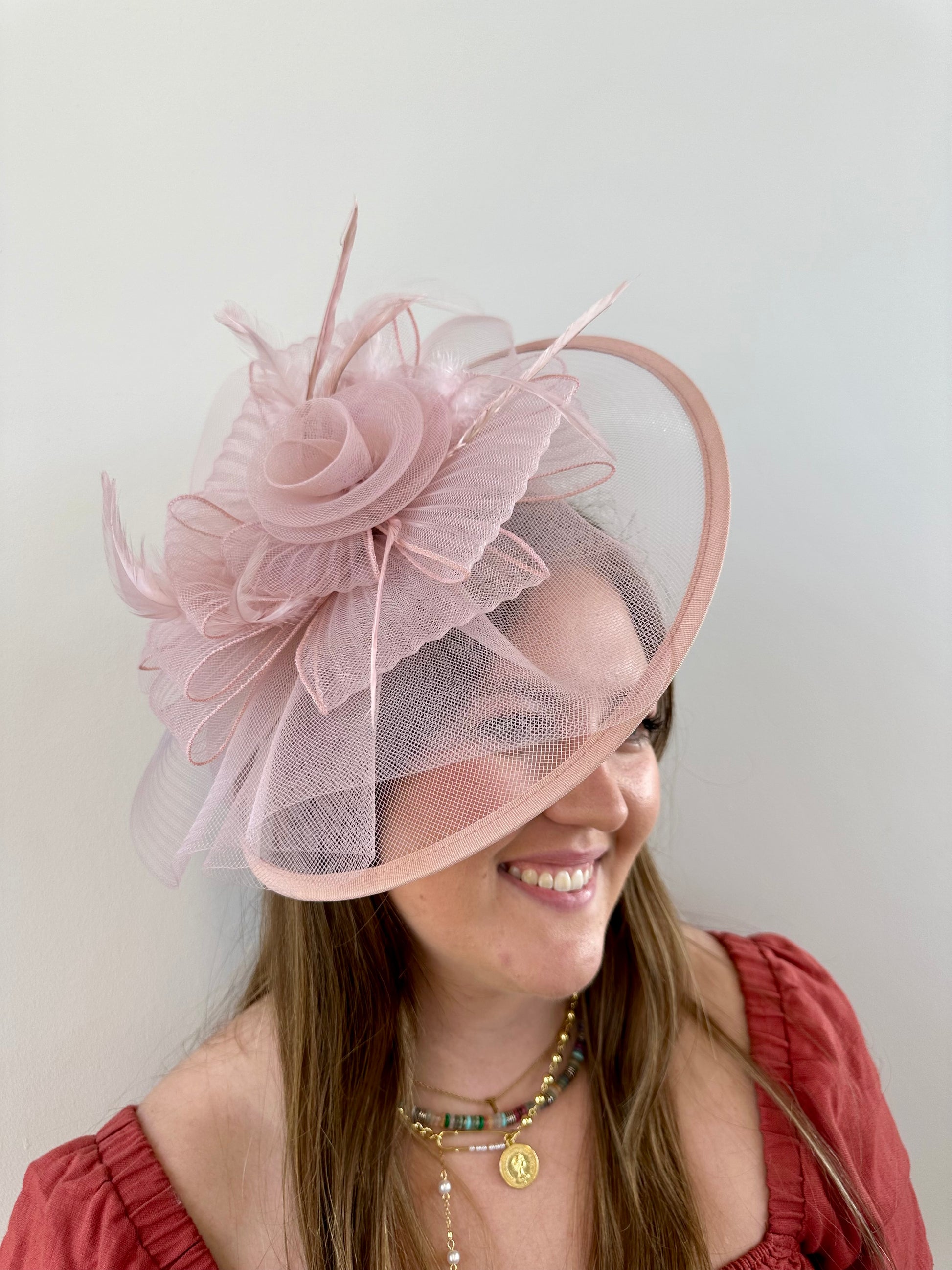 Dusty rose Kentucky Derby tilt mesh flower feathers fascinator with clip and headband.